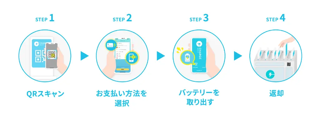 日本シェアNo.1のモバイルバッテリーのシェアリングサービス「CHARGESPOT」。レンタル方法は「CHARGESPOT」対応アプリでバッテリースタンドのQRをスキャンするだけの簡単操作です。日本全国47都道府県に約59,000台設置されており、グローバルでも香港、台湾、中国、タイ、シンガポール、マカオ、オーストラリア、,イタリアとエリアを拡大中です。 ※台数は2025年12月時点